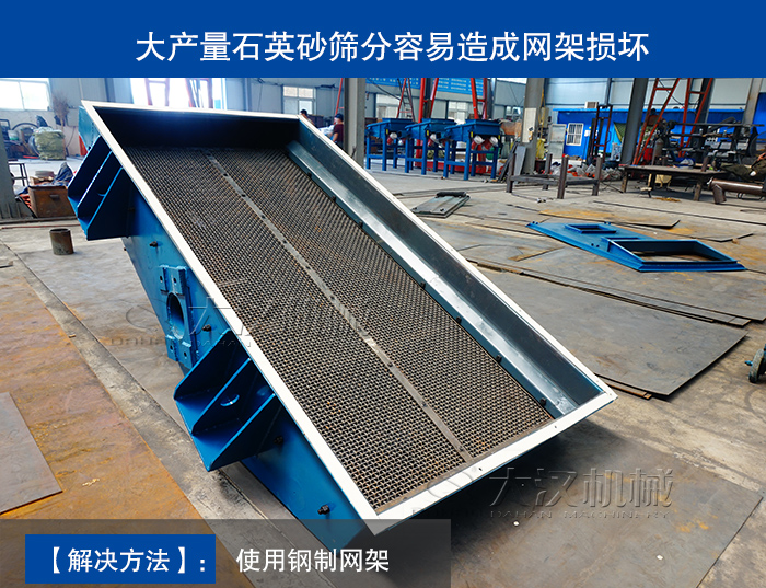 使用石英砂礦用振動篩來進行篩分時,篩分的石英砂都會有一定的的重量,使用普通網架容易造成破損的問題,所以需要使用鋼質網架來代替木質網架,增加網架和篩網的承受能力,更換為鋼制網架的石英砂礦用振動篩不僅換網比較方便,更可以延長篩網、篩機的使用壽命,鋼質網架使用壽命比木質網架長。