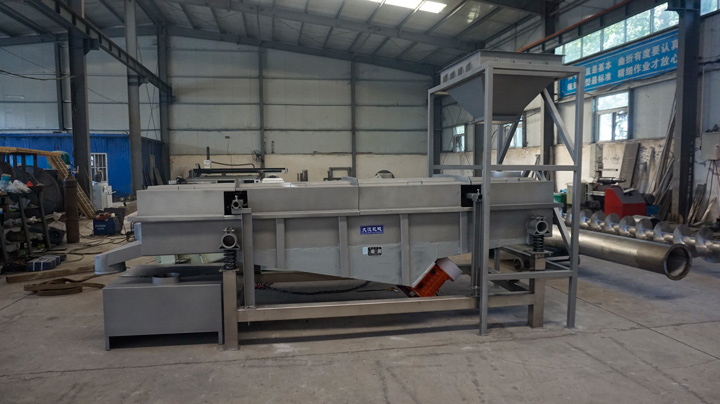 分離鋸末和石子專用振動(dòng)篩通過(guò)振動(dòng)篩網(wǎng)實(shí)現(xiàn)工作。當(dāng)設(shè)備啟動(dòng)時(shí),振動(dòng)電機(jī)產(chǎn)生水平振動(dòng)力,使篩體產(chǎn)生直線運(yùn)動(dòng)。原料混合物被投入篩體,受振動(dòng)力的作用下,原料在篩網(wǎng)上進(jìn)行篩分,鋸末和石子根據(jù)大小和重量的不同通過(guò)篩網(wǎng)分離。石子等較大顆粒沿篩面快速運(yùn)動(dòng),直接通過(guò)篩孔落入下方的出料口,而鋸末等較小顆粒則受到篩網(wǎng)的阻擋,無(wú)法通過(guò)篩孔,最終從另一出料口排出。這樣,鋸末和石子等不同顆粒尺寸的材料被有效分離,實(shí)現(xiàn)了精準(zhǔn)的分級(jí)和篩分操作。