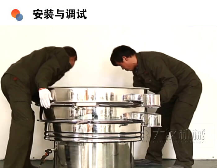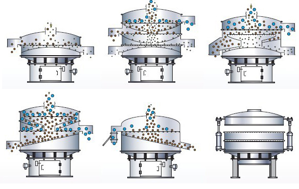 采用立式振動(dòng)電機(jī)作為激振源,通過(guò)振動(dòng)電機(jī)上下兩端的偏心重錘將旋轉(zhuǎn)運(yùn)動(dòng)轉(zhuǎn)變?yōu)樗健⒋怪薄A斜的三次元運(yùn)動(dòng),并傳遞到旋振篩的篩面上;物料通過(guò)入料口進(jìn)入設(shè)備內(nèi),根據(jù)不同物料篩分要求,物料經(jīng)過(guò)1-5層采用不同目數(shù)的金屬編織篩網(wǎng)的篩分層,在這個(gè)過(guò)程中,位于各層的篩網(wǎng)下的清網(wǎng)裝置(硅膠彈跳球)通過(guò)頻率振動(dòng)不斷撞擊篩網(wǎng),使篩網(wǎng)上層物料能夠順暢的透網(wǎng)篩分,并有效解決了物料堵網(wǎng)問(wèn)題出現(xiàn),不同目數(shù)的物料通過(guò)各層對(duì)應(yīng)目數(shù)的篩網(wǎng)后在各層的出料口排出,終實(shí)現(xiàn)篩選除雜或過(guò)濾分級(jí)的目的。