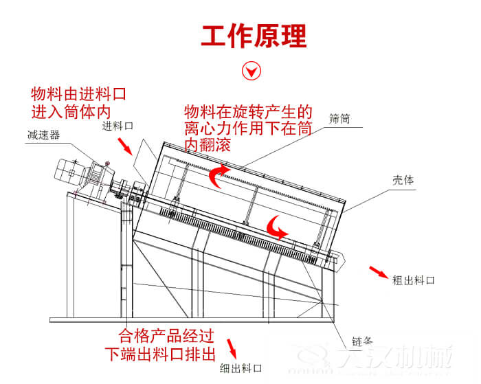 電機驅動滾筒軸線作旋轉運動,減速機調節筒體以一定的轉速旋轉,物料由進料口進入筒體內,在旋轉產生的離心力作用下,物料在筒內翻滾,自上而下通過分級篩網析出,由于篩網分級尺寸不同,物料逐漸被分離篩選,粒度合格的物料經篩分后落入到各自的漏斗,然后由人力方式運出或通過輸送機自流送往成品站。合格產品經過下端出料口排出,顆粒較大,分選不合格的產品經另一排料口排出,筒內清理裝置,使篩網不宜被阻塞。