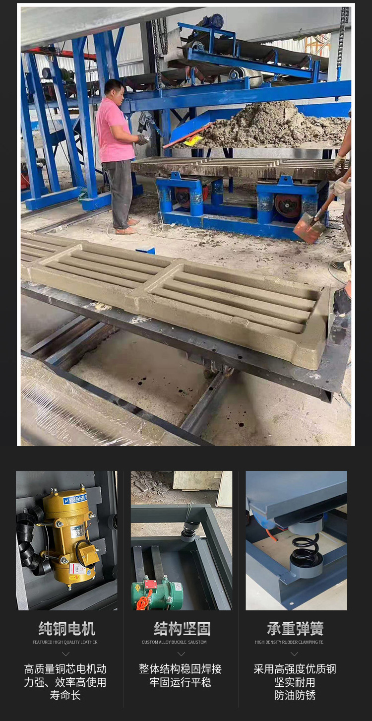 工作臺(tái)下面的臥式振動(dòng)電機(jī)產(chǎn)生足夠的澎湃均勻的激振力并傳導(dǎo)到臺(tái)面上,從而驅(qū)動(dòng)臺(tái)面上的模具中的水泥等澆筑液在激烈的震蕩下產(chǎn)生上下運(yùn)動(dòng)的加速度,從而擠壓出物料間的氣泡,減少澆注液體間的空氣間隙,從而達(dá)到提升預(yù)制件等澆筑模具的質(zhì)量提升的目的。