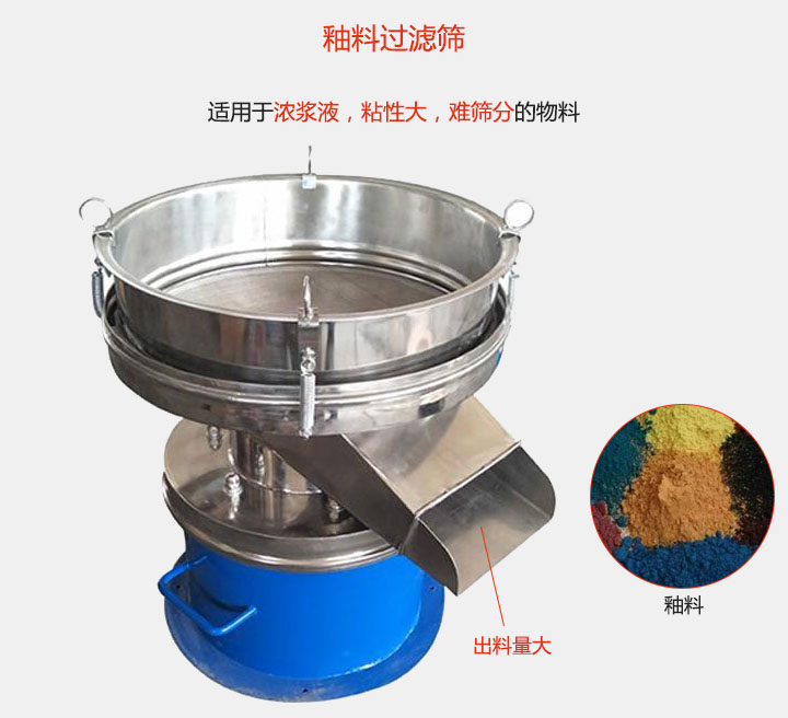 釉料過濾篩有被稱之為450過濾篩該產品是根據濃漿液,粘性大,難篩分的物料而設計的高性能,低耗能的漿液專用過濾篩,過濾篩分機。該篩機為單網設計,篩網使用壽命長,出料口設計在振動體上,出料量大。