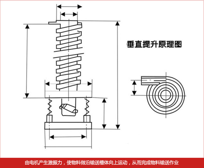 螺旋垂直振動提升機(jī)DZC系列垂直振動輸送機(jī)的驅(qū)動裝置振動電機(jī)安裝在輸送塔下部,兩臺振動電機(jī)對稱交叉安裝,輸送塔由管體和焊接在管體周圍的螺旋輸送槽組成,輸送塔座于減振裝置上,減振裝置由底座和隔振彈簧組成。當(dāng)垂直輸送機(jī)工作時,根據(jù)雙振動電機(jī)自同步原理,由振動電機(jī)產(chǎn)生激振力,強(qiáng)迫整個輸送塔體作水平圓運(yùn)動和向上垂直運(yùn)動的空間復(fù)合振動,螺旋槽內(nèi)的物料則受輸送槽的作用,作勻速拋擲圓運(yùn)動,沿輸送槽體向上運(yùn)動,從而完成物料的向上(或向下)輸送作業(yè)。